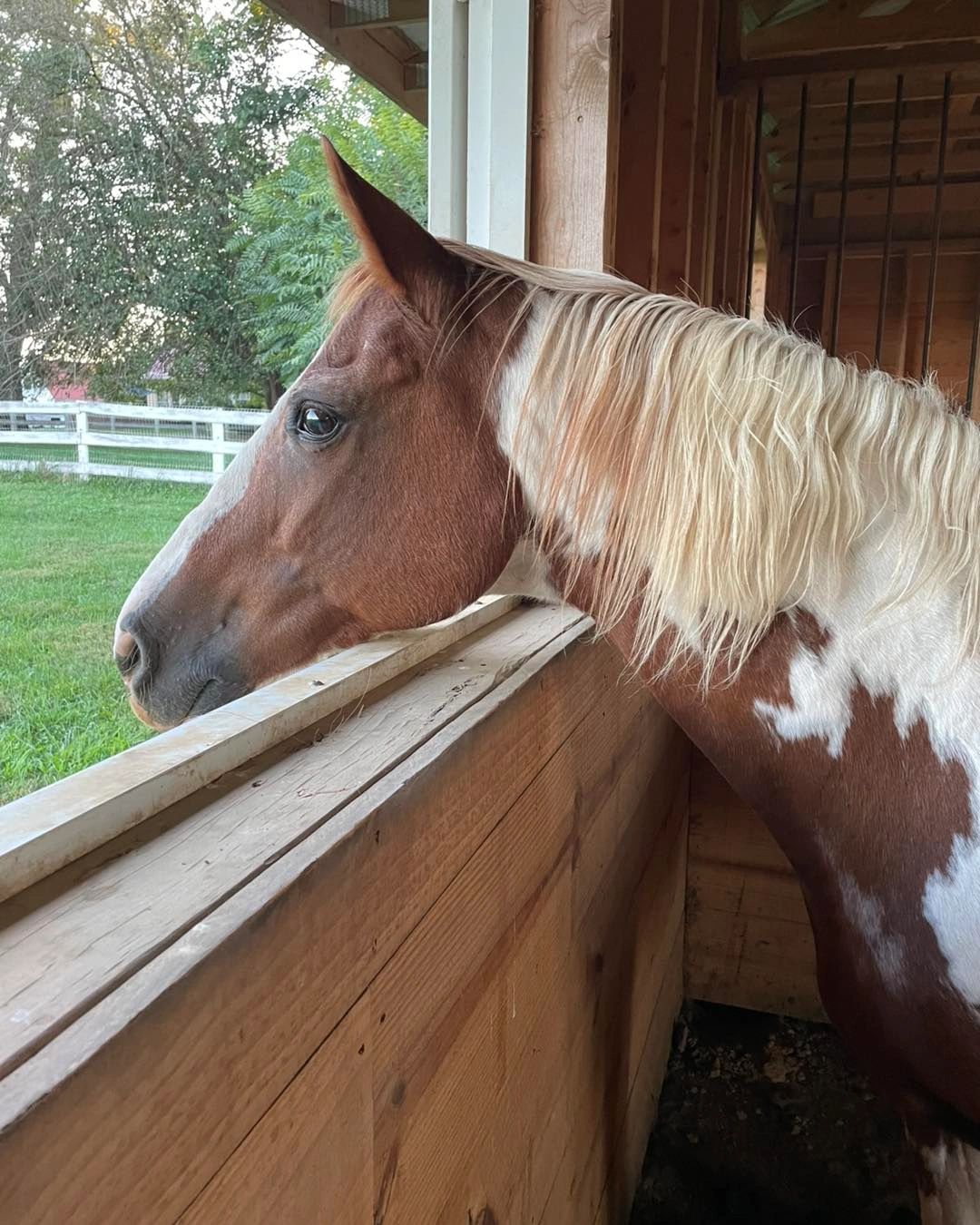 The beautiful Grace. Grace is a blind Saddlebred that was picked up in a ship pen by another rescue. When they reached out needing a sanctuary that could take a blind horse, we stepped up immediately. Grace is so very special and living her best life now.